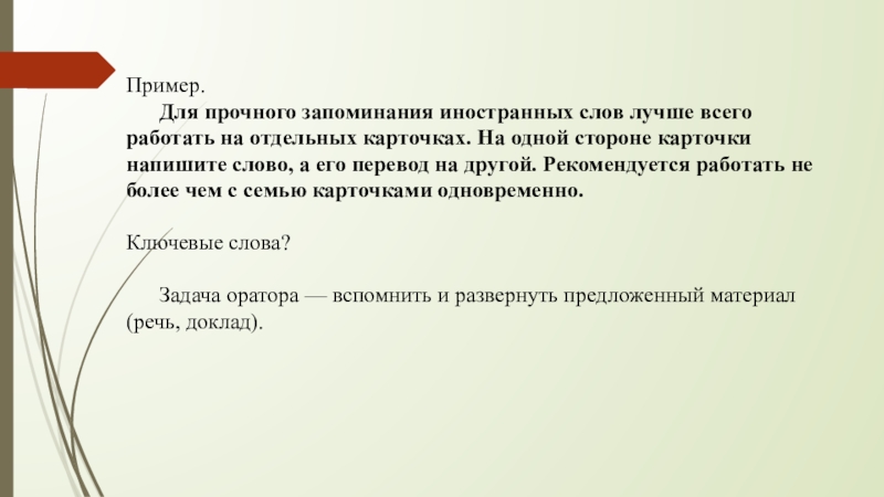том, что следует находить в каждой фразе ключевые, или опорные, слова, которые помогают быстро вспомнить целиком всю фразу. Ключевое слово дает оратору своеобразный мыслительный импульс, и это побуждает его раскрыть мысль.