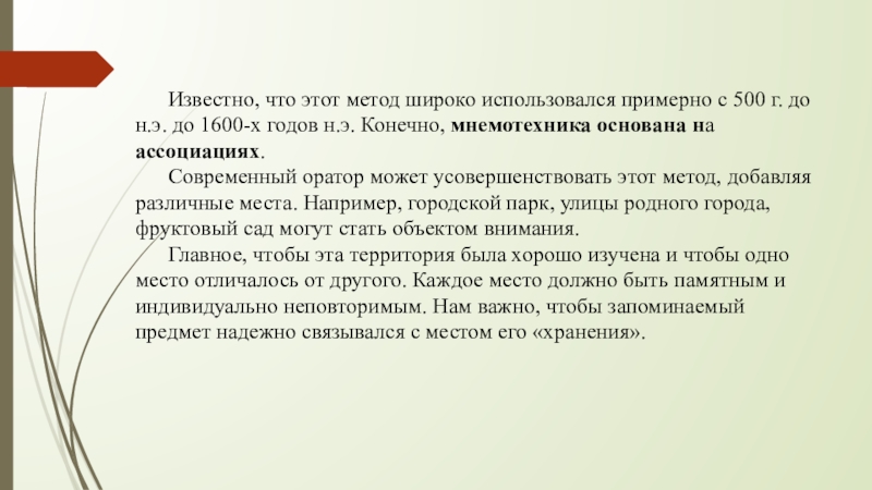 I. Одним из старейших методов запоминания ораторских речей является метод loch или метод мест (слово loci по-латыни означает «место»). Этот метод состоит в том, что необходимая информация размещается в воображаемых местах. Чтобы вспомнить фрагмент речи, необходимо вспоминать место, где он «хранится».