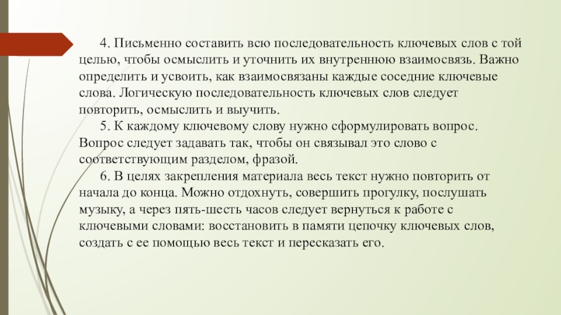 осмыслить и уточнить их внутреннюю взаимосвязь. Важно определить и усвоить, как взаимосвязаны каждые соседние ключевые слова. Логическую последовательность ключевых слов следует повторить, осмыслить и выучить.