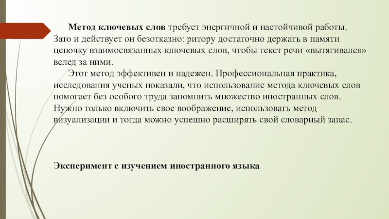 Слайд 11 Метод ключевых слов требует энергичной и настойчивой работы. Зато и действует