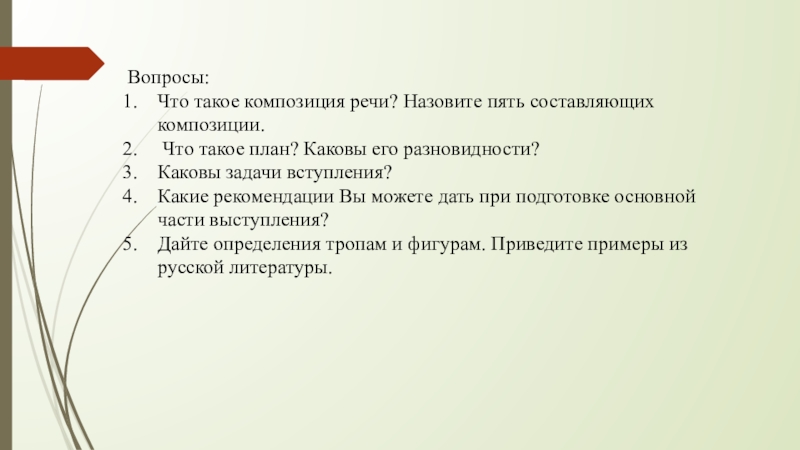 Что такое композиция речи? Назовите пять составляющих композиции.