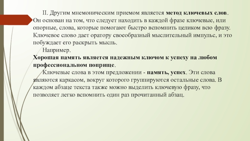 Слайд 7 II. Другим мнемоническим приемом является метод ключевых слов. Он основан на