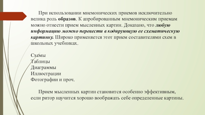 Слайд 12 При использовании мнемонических приемов исключительно велика роль образов. К апробированным мнемоническим
