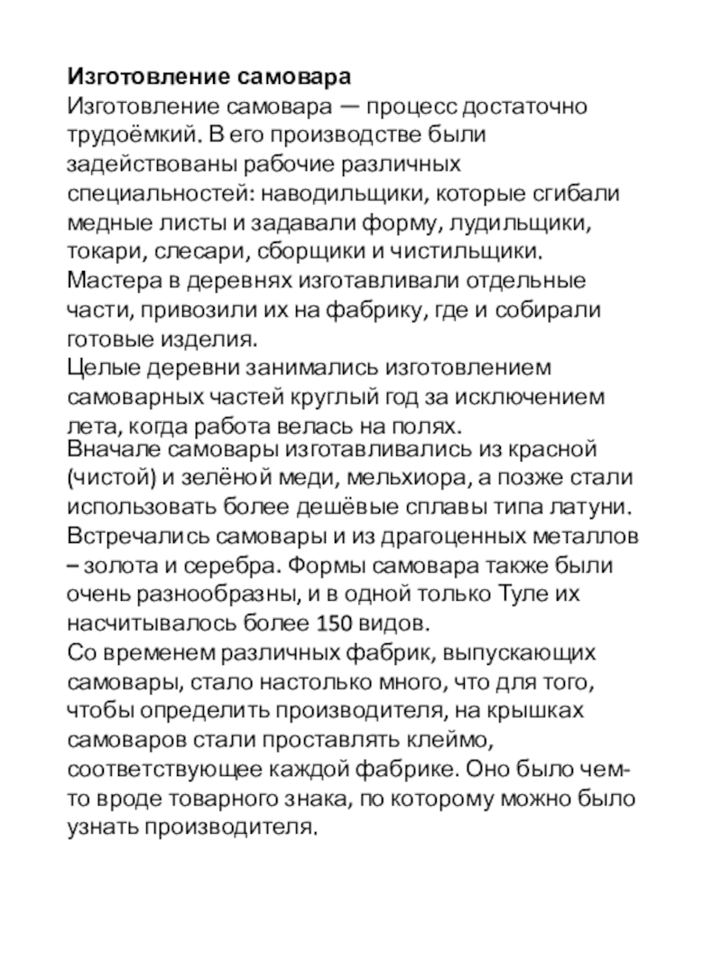 Вначале самовары изготавливались из красной (чистой) и зелёной меди, мельхиора, а позже стали использовать более дешёвые сплавы типа латуни. Встречались самовары и из драгоценных металлов – золота и серебра. Формы самовара также были очень разнообразны, и в одной только Туле их насчитывалось более 150 видов.