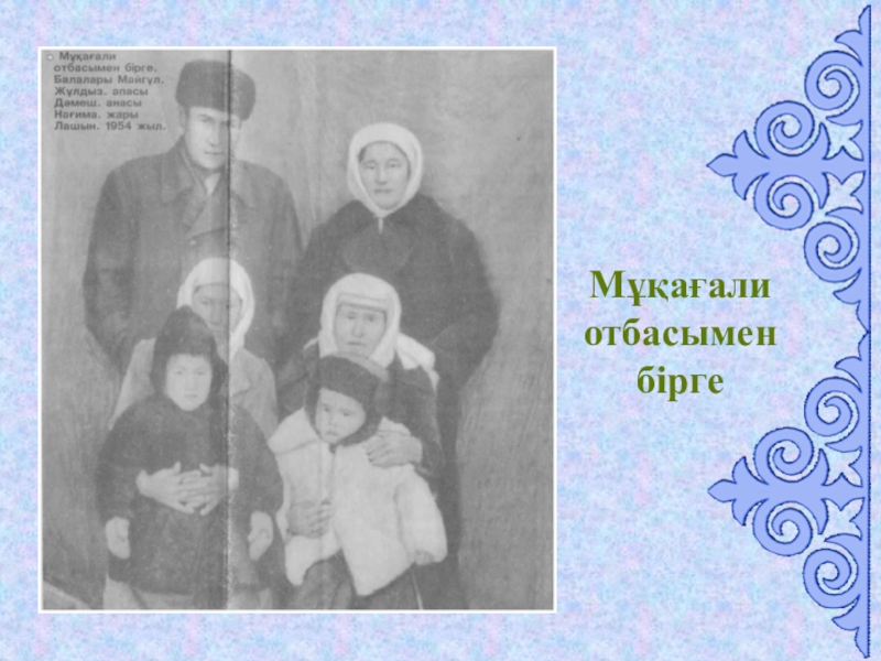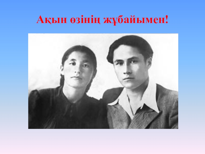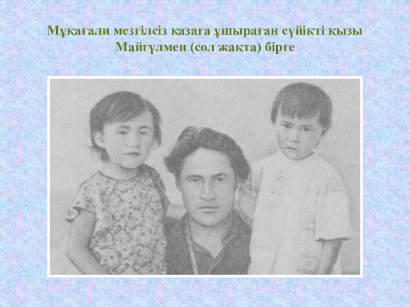 Слайд 29Мұқағали мезгілсіз қазаға ұшыраған сүйікті қызы Майгүлмен (сол жақта) бірге