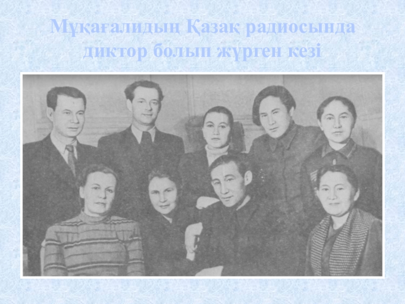 Слайд 17Мұқағалидың Қазақ радиосында диктор болып жүрген кезі
