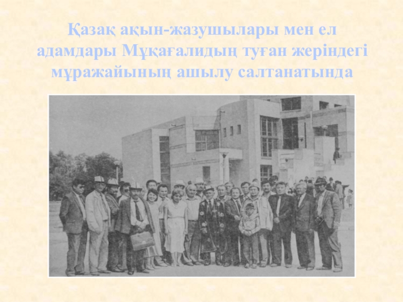 Слайд 41Қазақ ақын-жазушылары мен ел адамдары Мұқағалидың туған жеріндегі мұражайының ашылу салтанатында