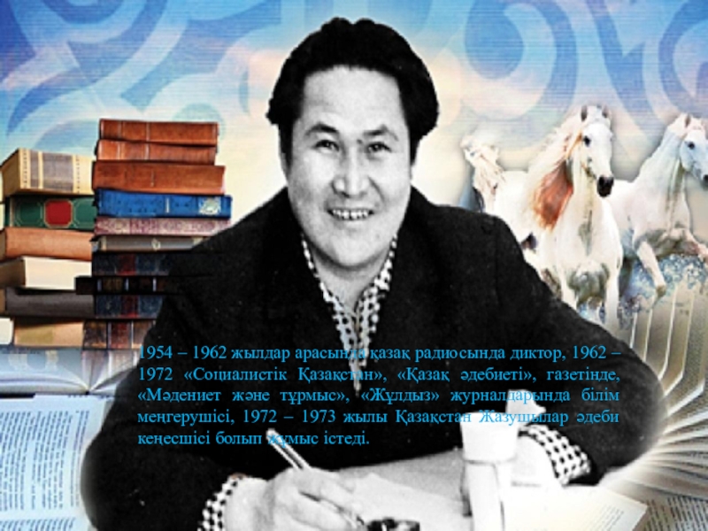 Слайд 131954 – 1962 жылдар арасында қазақ радиосында диктор, 1962 – 1972