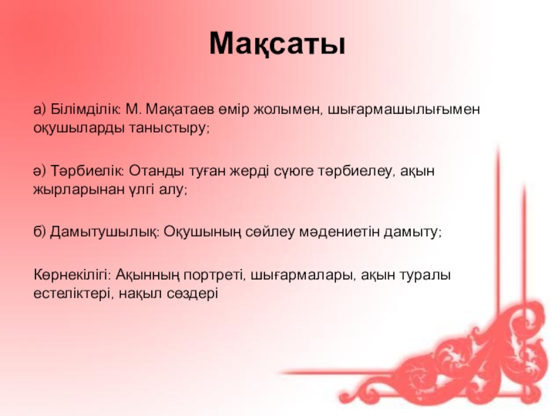 а) Білімділік: М. Мақатаев өмір жолымен, шығармашылығымен оқушыларды таныстыру;