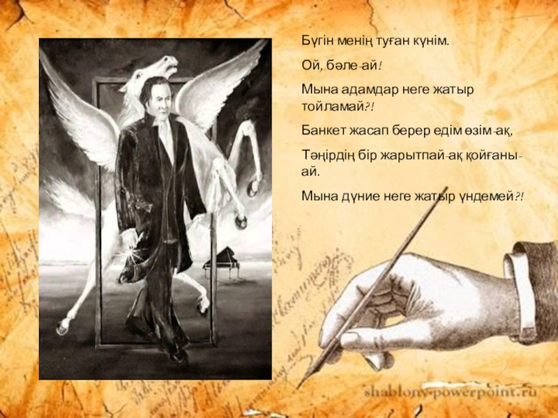 Бүгін менің туған күнім.Ой, бәле-ай!Мына адамдар неге жатыр тойламай?!Банкет жасап берер едім өзім-ақ,Тәңірдің бір жарытпай-ақ қойғаны-ай.Мына дүние