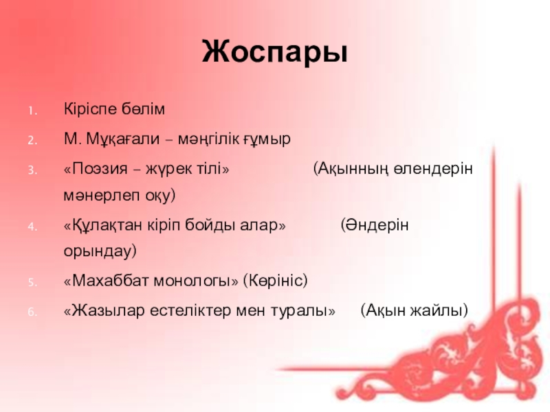 ЖоспарыКіріспе бөлімМ. Мұқағали – мәңгілік ғұмыр«Поэзия – жүрек тілі»