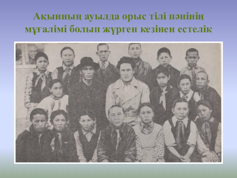 Слайд 15Ақынның ауылда орыс тілі пәнінің мұғалімі болып жүрген кезінен естелік