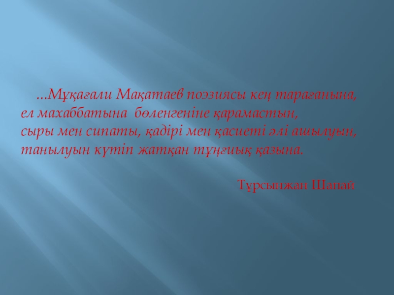 ...Мұқағали Мақатаев поэзиясы кең тарағанына, ел махаббатына бөленгеніне қарамастын, сыры мен сипаты, қадірі мен қасиеті