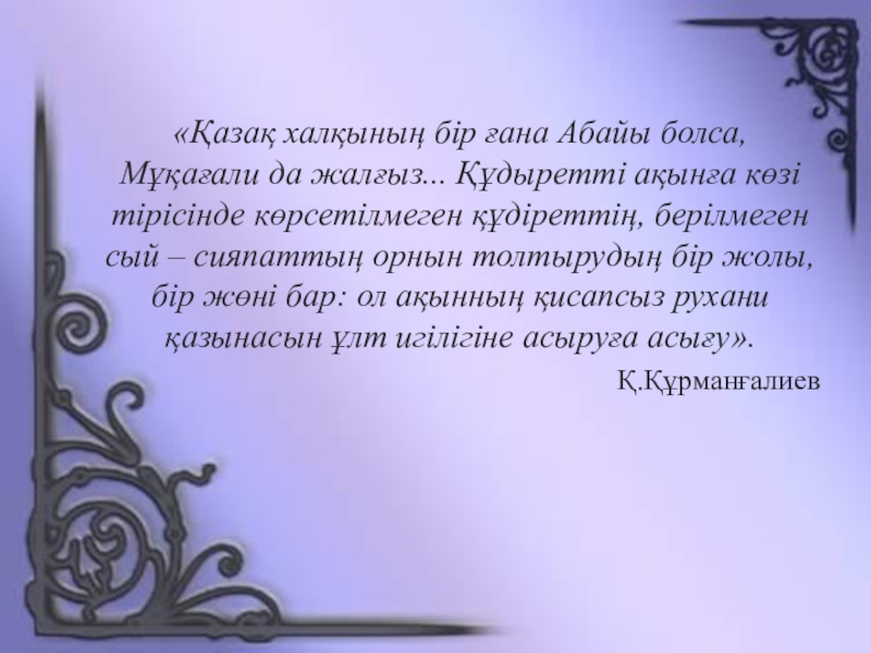 Слайд 12«Қазақ халқының бір ғана Абайы болса, Мұқағали да жалғыз... Құдыретті ақынға
