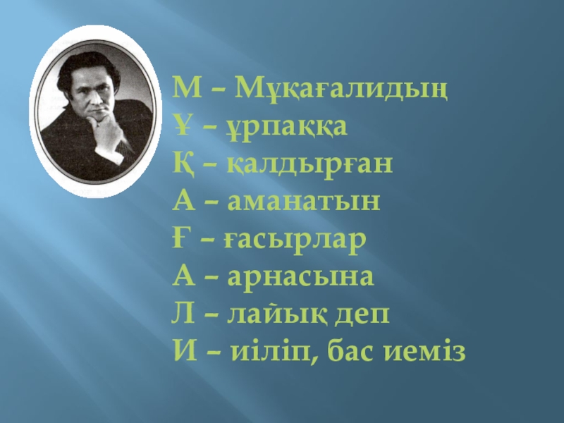 М – МұқағалидыңҰ – ұрпаққаҚ – қалдырғанА – аманатынҒ – ғасырларА – арнасынаЛ – лайық депИ –