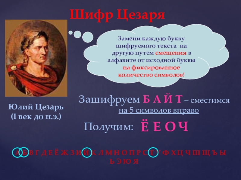 Зашифруем Б А Й Т – сместимся на 5 символов вправо