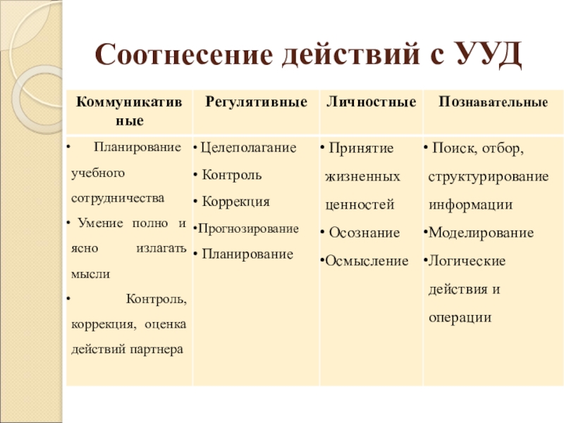 Осмыслить содержание видов УУД в соответствии с действиями
