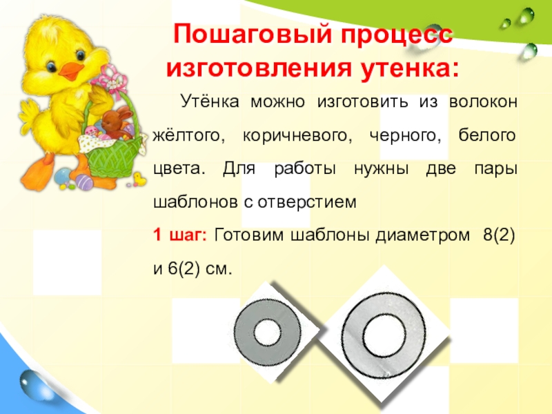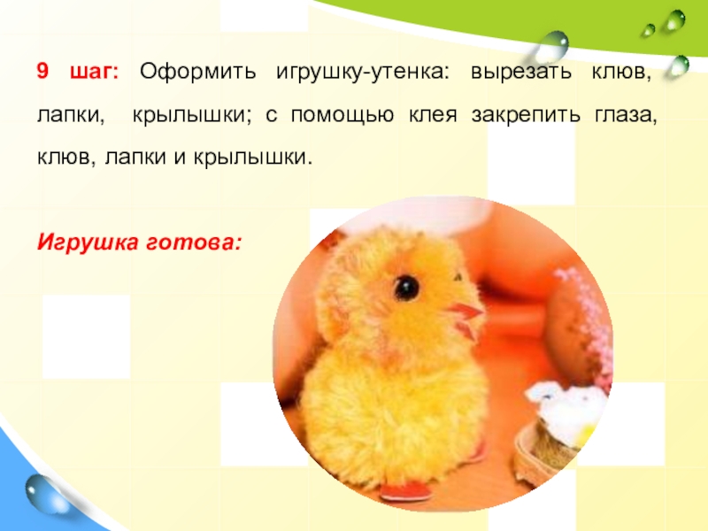 Слайд 339 шаг: Оформить игрушку-утенка: вырезать клюв, лапки, крылышки; с помощью клея
