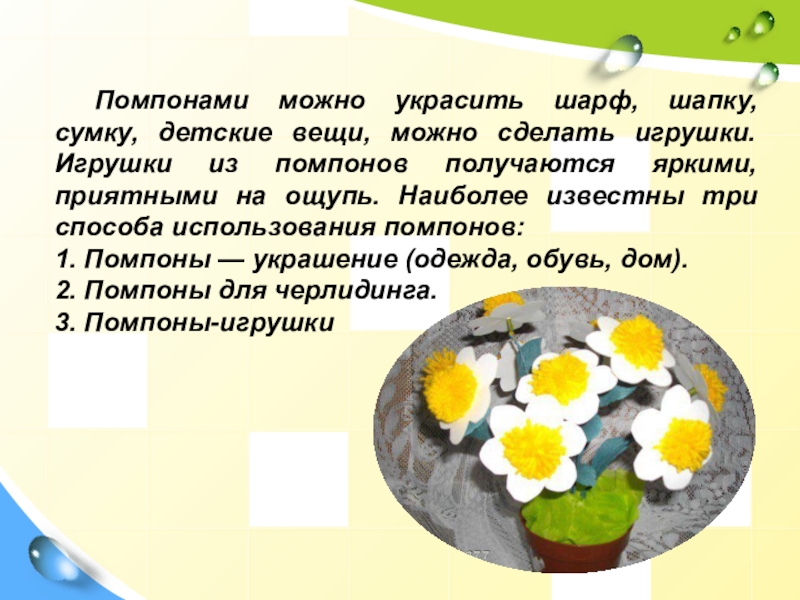 Ознакомить с идеями применения помпонов в декорации интерьера, одежды, игрушек;