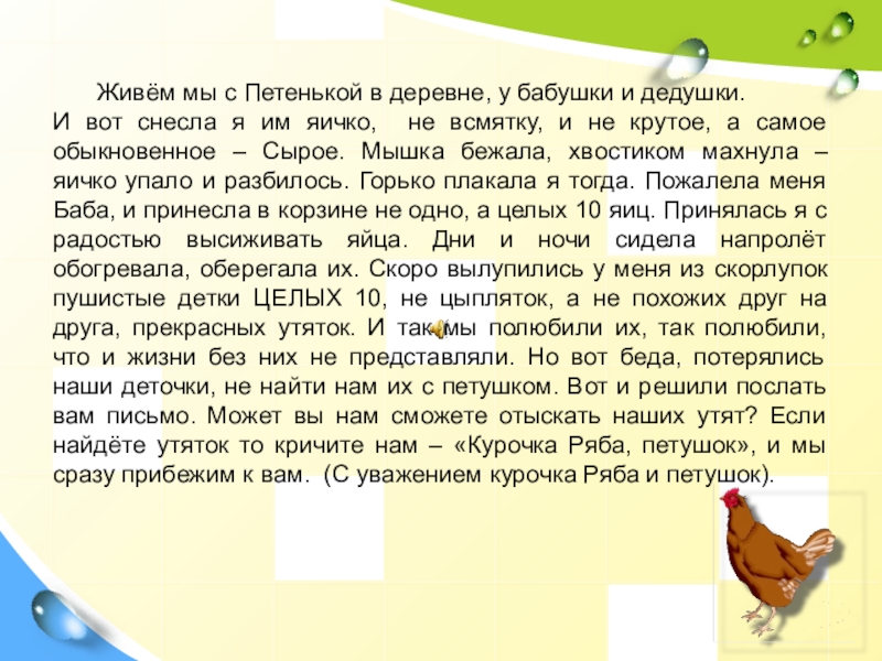 вот снесла я им яичко, не всмятку, и не крутое, а самое обыкновенное – Сырое. Мышка бежала, хвостиком махнула – яичко упало и разбилось. Горько плакала я тогда. Пожалела меня Баба, и принесла в корзине не одно, а целых 10 яиц. Принялась я с радостью высиживать яйца. Дни и ночи сидела напролёт обогревала, оберегала их. Скоро вылупились у меня из скорлупок пушистые детки ЦЕЛЫХ 10, не цыпляток, а не похожих друг на друга, прекрасных утяток. И так мы полюбили их, так полюбили, что и жизни без них не представляли. Но вот беда, потерялись наши деточки, не найти нам их с петушком. Вот и решили послать вам письмо. Может вы нам сможете отыскать наших утят? Если найдёте утяток то кричите нам – «Курочка Ряба, петушок», и мы сразу прибежим к вам. (С уважением курочка Ряба и петушок).