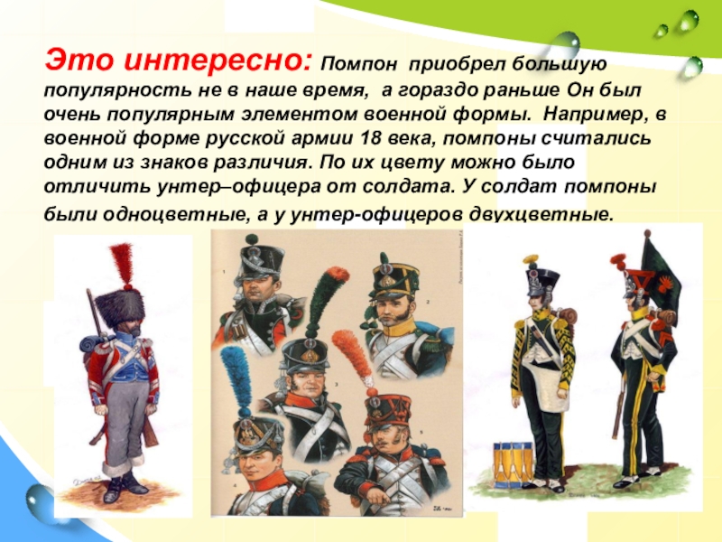 отличить унтер–офицера от солдата. У солдат помпоны