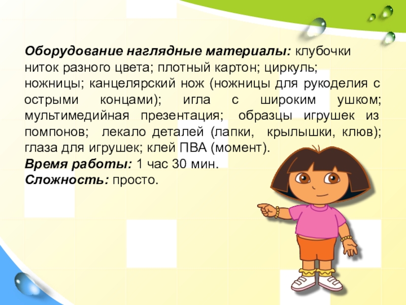 канцелярский нож (ножницы для рукоделия с острыми концами); игла с широким ушком; мультимедийная презентация; образцы игрушек из помпонов; лекало деталей (лапки, крылышки, клюв); глаза для игрушек; клей ПВА (момент).