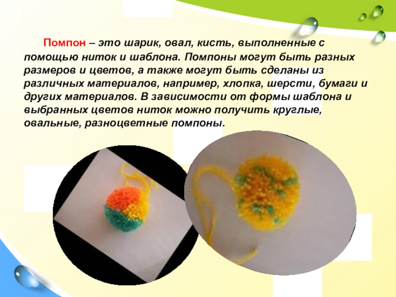 Слайд 8 Помпон – это шарик, овал, кисть, выполненные с