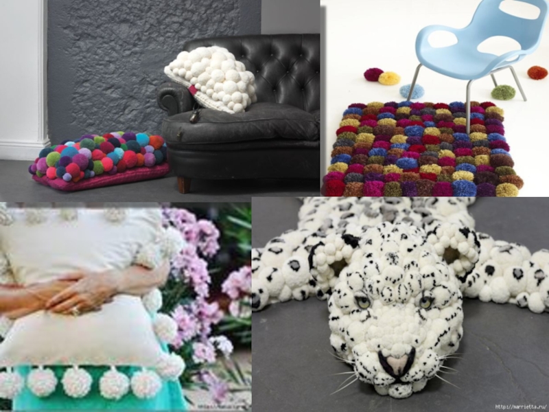 Слайд 9 Помпонами можно украсить шарф, шапку, сумку, детские вещи, можно сделать игрушки.