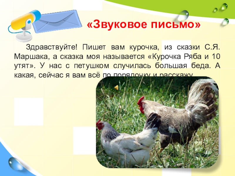 Здравствуйте! Пишет вам курочка, из сказки С.Я.Маршака, а сказка моя