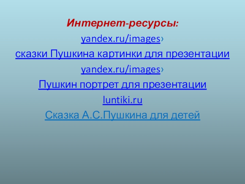 Интернет-ресурсы:yandex.ru/images›сказки Пушкина картинки для презентацииyandex.ru/images›Пушкин портрет для презентацииluntiki.ru Сказка А.С.Пушкина для детей