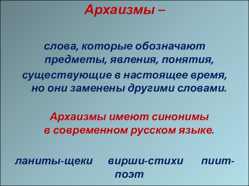 Архаизмы – слова, которые обозначают         предметы, явления, понятия, существующие