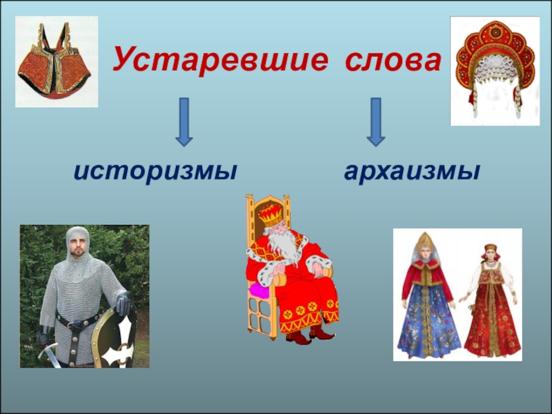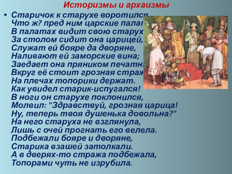 Историзмы и архаизмыСтаричок к старухе воротился, Что ж? пред ним царские палаты, В палатах видит свою старуху,