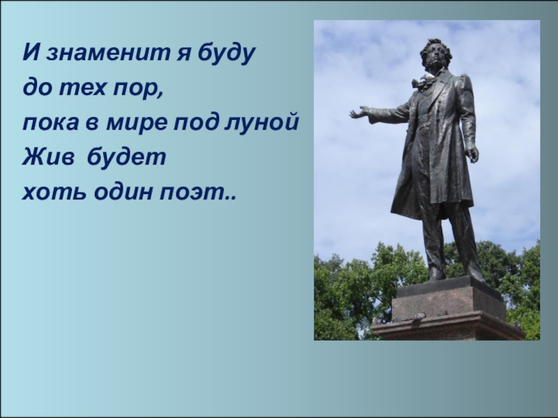 И славен буду я, доколь в подлунном мире,Жив будет хоть один пиит.