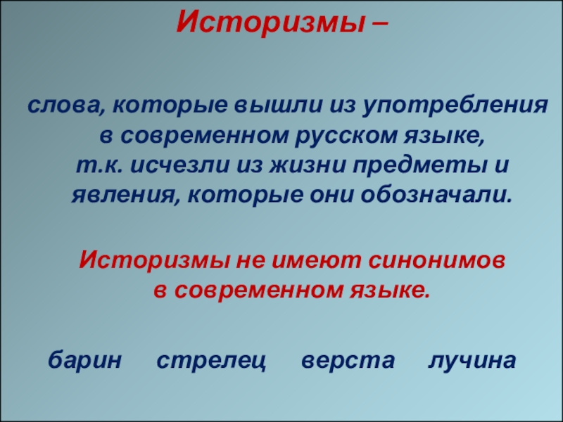 Историзмы – слова, которые вышли из употребления       в современном русском языке,