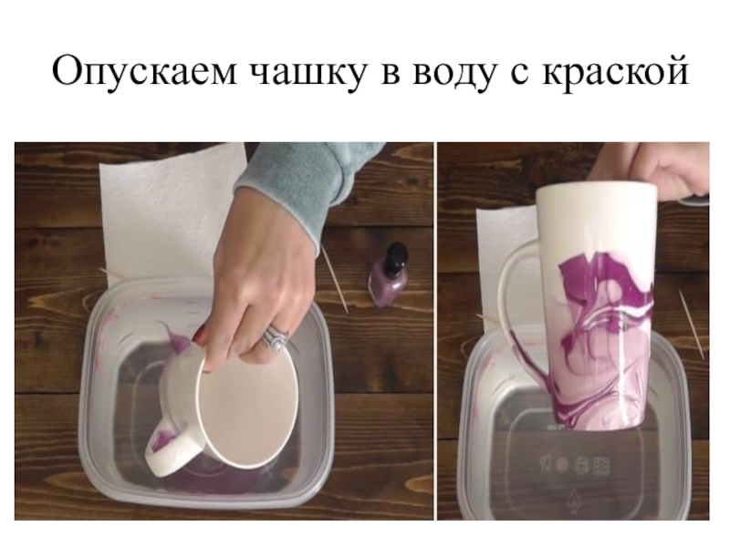 Слайд 14Опускаем чашку в воду с краской