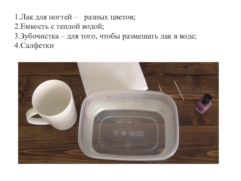 1.Лак для ногтей –  разных цветов;   2.Емкость с теплой водой; 3.Зубочистка – для того,