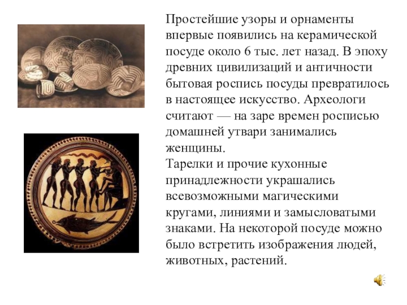 тыс. лет назад. В эпоху древних цивилизаций и античности бытовая роспись посуды превратилось в настоящее искусство. Археологи считают — на заре времен росписью домашней утвари занимались женщины. Тарелки и прочие кухонные принадлежности украшались всевозможными магическими кругами, линиями и замысловатыми знаками. На некоторой посуде можно было встретить изображения людей, животных, растений.