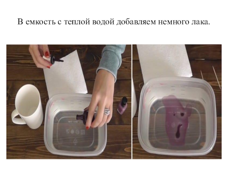 Слайд 12В емкость с теплой водой добавляем немного лака.
