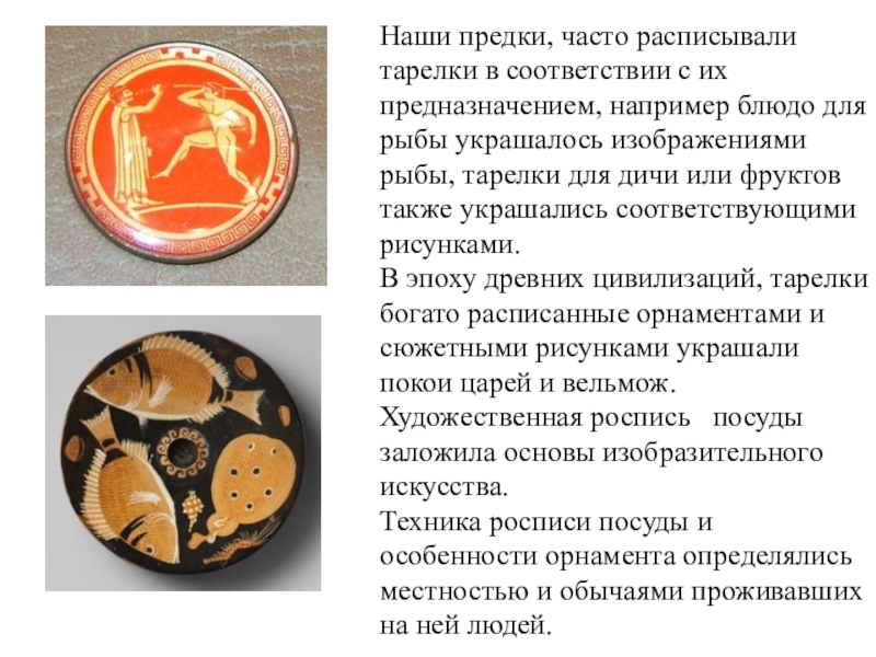 блюдо для рыбы украшалось изображениями рыбы, тарелки для дичи или фруктов также украшались соответствующими рисунками. В эпоху древних цивилизаций, тарелки богато расписанные орнаментами и сюжетными рисунками украшали покои царей и вельмож. Художественная роспись посуды заложила основы изобразительного искусства. Техника росписи посуды и особенности орнамента определялись местностью и обычаями проживавших на ней людей.