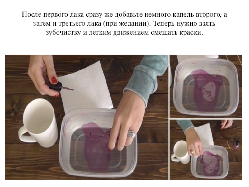 Слайд 13После первого лака сразу же добавьте немного капель второго, а затем