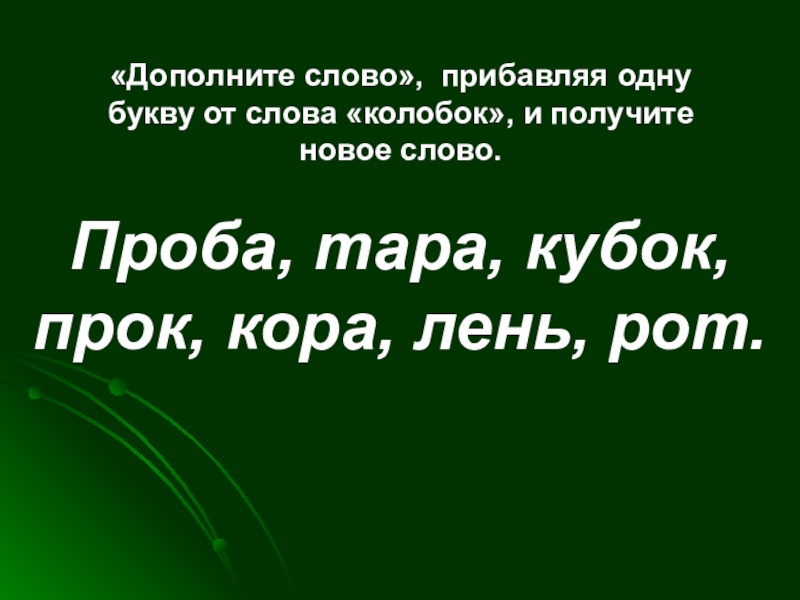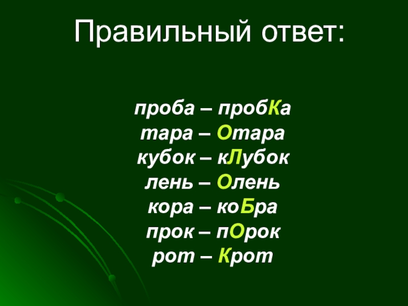 Проба, тара, кубок, прок, кора, лень, рот.