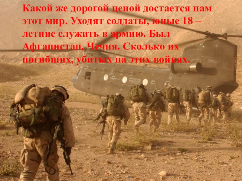 Слайд 14Какой же дорогой ценой достается нам этот мир. Уходят солдаты, юные