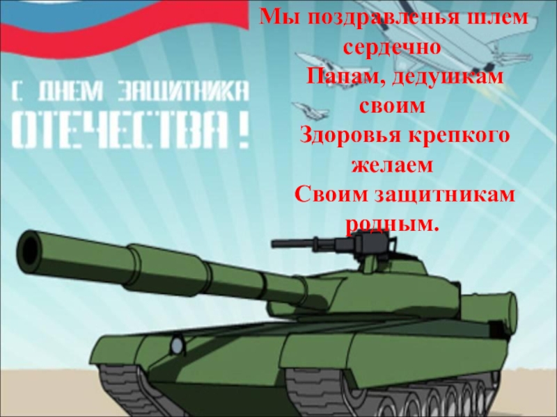 Мы поздравленья шлем сердечно  Папам, дедушкам своим  Здоровья крепкого желаем  Своим защитникам родным.