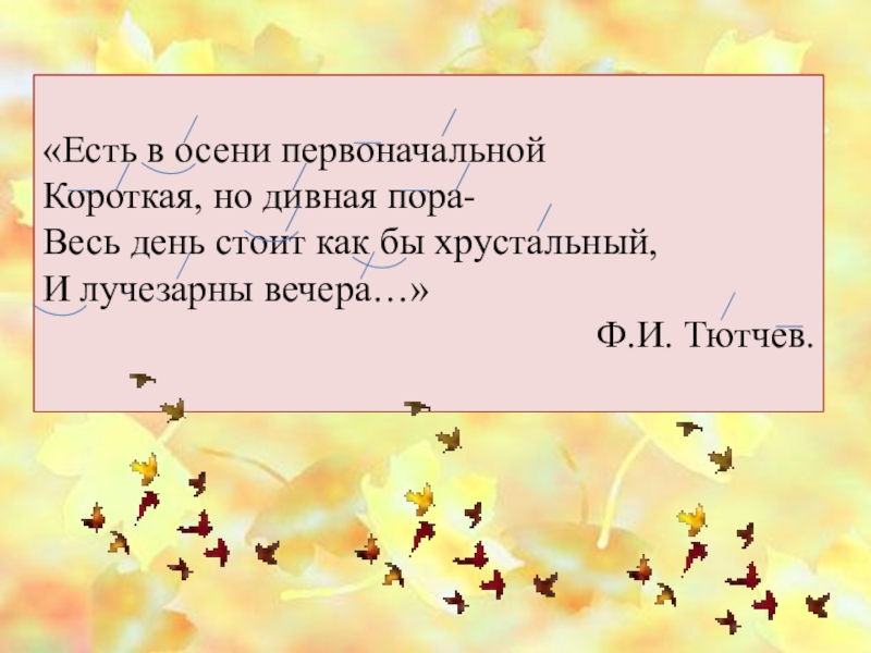 «Есть в осени первоначальнойКороткая, но дивная пора-Весь день стоит как бы хрустальный,И лучезарны вечера…»Ф.И. Тютчев.