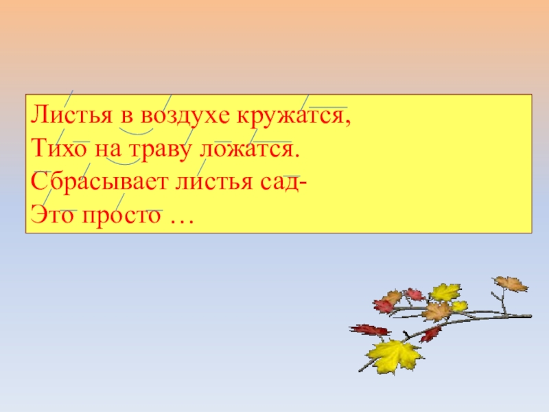 Листья в воздухе кружатся,Тихо на траву ложатся.Сбрасывает листья сад-Это просто …