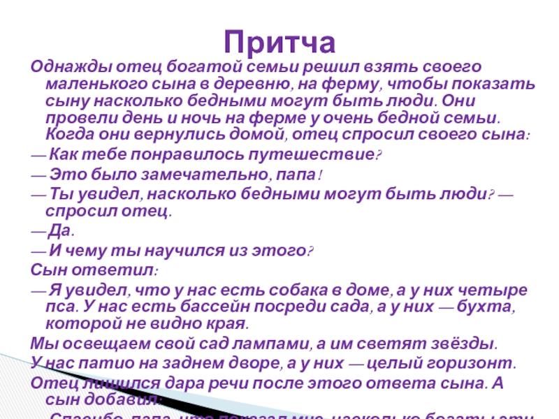 — Ты увидел, насколько бедными могут быть люди? — спросил отец.