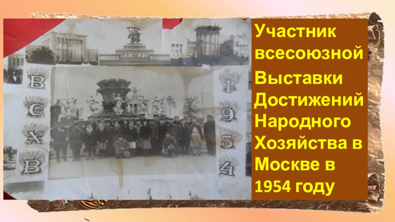Участник всесоюзнойВыставки Достижений Народного Хозяйства в Москве в 1954 году