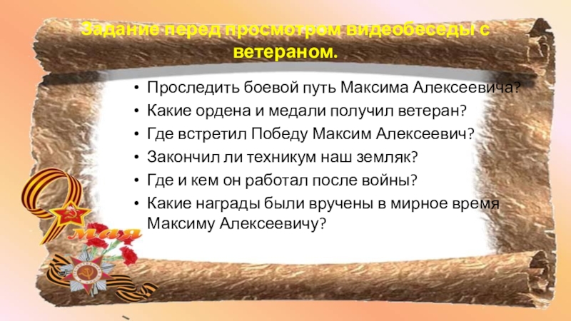 Задание перед просмотром видеобеседы с ветераном.Проследить боевой путь Максима Алексеевича?Какие ордена и медали получил ветеран?Где встретил Победу