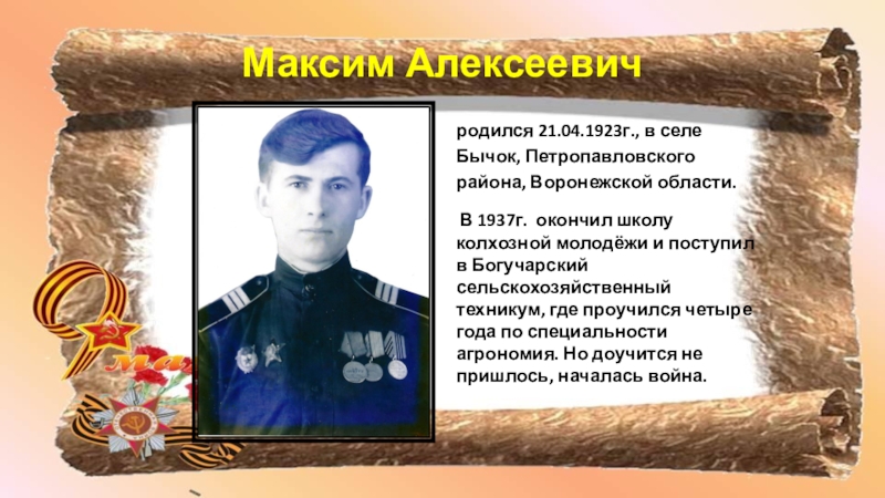 Максим Алексеевичродился 21.04.1923г., в селе Бычок, Петропавловского района, Воронежской области. В 1937г. окончил школу колхозной молодёжи и