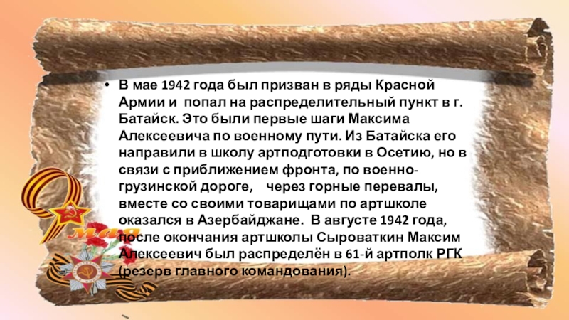 попал на распределительный пункт в г. Батайск. Это были первые шаги Максима Алексеевича по военному пути. Из Батайска его направили в школу артподготовки в Осетию, но в связи с приближением фронта, по военно-грузинской дороге, через горные перевалы, вместе со своими товарищами по артшколе оказался в Азербайджане. В августе 1942 года, после окончания артшколы Сыроваткин Максим Алексеевич был распределён в 61-й артполк РГК (резерв главного командования).